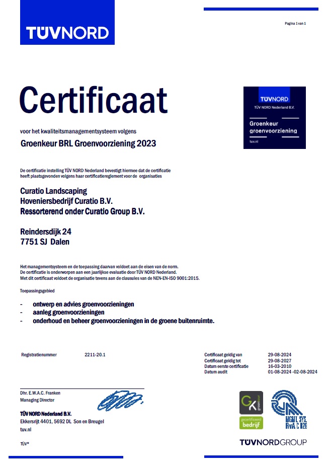 Curatio staat voor kwaliteit, betrouwbaarheid en verantwoordelijkheid samen met onze certificeringen en maatschappelijk verantwoord ondernemen . Samen maken we de buitenruimte mooier — en de wereld een stukje groener.